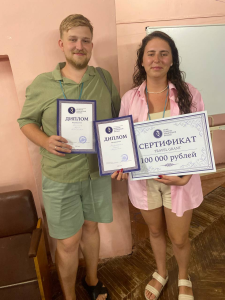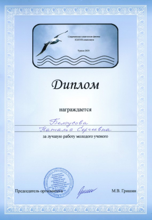 По итогам проведения XXXVII Симпозиума «Современная химическая физика» организаторы традиционно отметили высокий уровень докладов наших молодых учёных, вручив диплом за активное участие в работе Симпозиума.