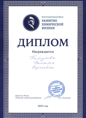 По итогам проведения XXXVII Симпозиума «Современная химическая физика» организаторы традиционно отметили высокий уровень докладов наших молодых учёных, вручив диплом за активное участие в работе Симпозиума.